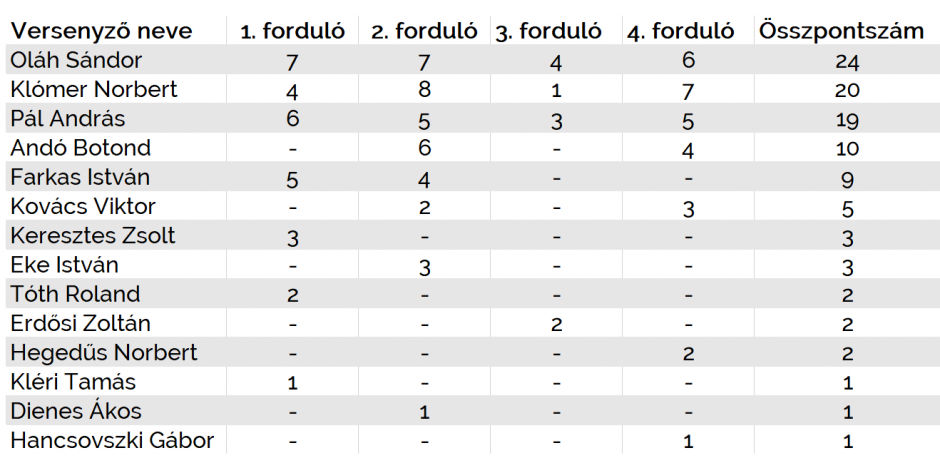 A 4. fordulóval zárult ma délelőtt a III. Don Bosco Amatőr Fallabda bajnokság a DBS-ben, ahol az összetettben éllovasként érkező Oláh Sándor lett a 2018-19-es idény bajnoka.