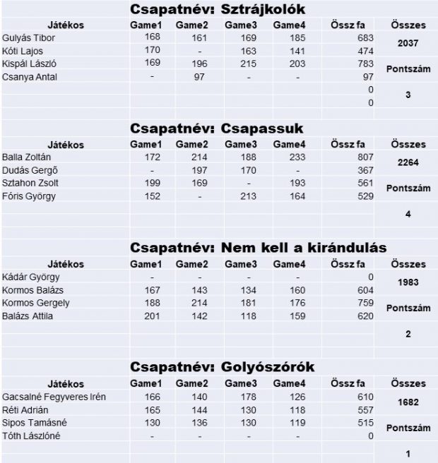 IV. Don Bosco Amatőr Bowling Bajnokság Csapat kategória, 2. forduló, eredmények: