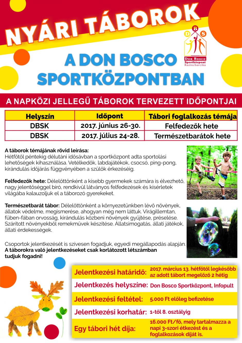 Első alkalommal rendezünk nyári tábort június és július utolsó hetében a Don Bosco Sportközpontban. (Részletek a mellékelt plakáton.)